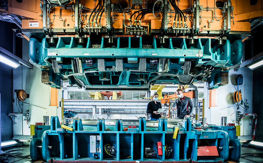 Όταν η μαζική παραγωγή βρίσκεται σε λειτουργία, οι πρέσες του Τσβικάου χρειάζονται συνολικά έξι στάδια για να σχηματίσουν το πλαϊνό πάνελ, το καθένα χρησιμοποιώντας ένα συγκεκριμένο μηχανουργικό εργαλείο. Μεταξύ αυτών, ειδικές δαγκάνες μεταφέρουν το φύλλο μετάλλου από τη μία πρέσα στην άλλη. Η πρώτη σχηματίζει τα όρια του φύλλου μετάλλου στο επιθυμητό σχήμα και οι επόμενες χρησιμοποιούνται για να κόψουν και να τριμάρουν κατάλληλα, για παράδειγμα στην περιοχή που περιβάλλει τα πλευρικά παράθυρα, για να δημιουργήσουν τις λεπτές ακμές και τις γραμμές, τις οπές συναρμολόγησης, τις υποδοχές και όλα τα περίπλοκα κοψίματα που είναι απαραίτητα για τις επόμενες διαδικασίες συγκόλλησης και μορφοποίησης στην κατασκευή του αμαξώματος. Επειδή το φύλλο τείνει ενίοτε να πετσικάρει ελαφρά, επαναδιαμορφώνεται συνεχώς, σε κάθε βήμα εργασίας. Αυτό που στην αρχή της διαδικασίας είναι επίπεδο και άμορφο, εμφανίζεται στο τέλος του κύκλου ως τρισδιάστατο πάνελ, με εμφανή τον υψηλότερο βαθμό ακρίβειας στην κατασκευή και το σύγχρονο design.