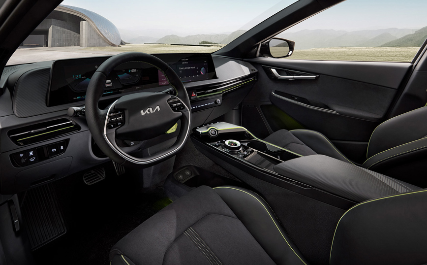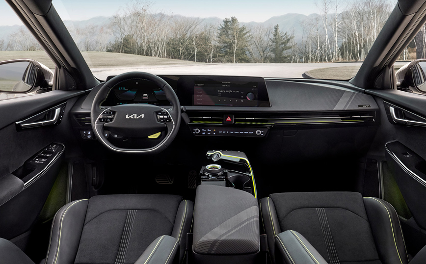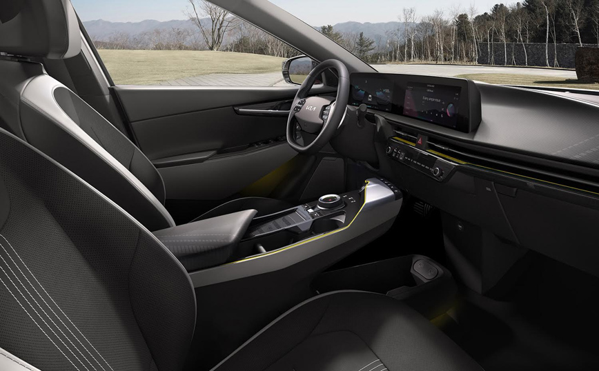 Παρά τις συμπαγείς εξωτερικές διαστάσεις του EV6, το μεταξόνιο των 2.900 χιλιοστών οδηγεί σε χώρο καμπίνας παρόμοιο με πολλά SUV μεσαίου μεγέθους. Ένα από τα πιο εντυπωσιακά στοιχεία είναι η high-tech ελαφρώς κυρτή οθόνη πολυμέσων. Τα άνετα καθίσματα είναι λεπτά, ελαφριά και επενδυμένα με μοντέρνα, ενδιαφέροντα οπτικά υφάσματα, που δημιουργήθηκαν με ανακυκλωμένα πλαστικά ισοδύναμα με 111 πλαστικά μπουκάλια νερού.