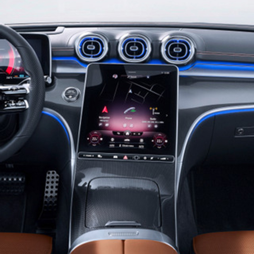 Η μετάβαση προς την ψηφιοποίηση αντανακλάται και στην κεντρική, OLED οθόνη αφής (επίσης με κλίση προς τον οδηγό), η οποία επιτρέπει τον έλεγχο των λειτουργιών του αυτοκινήτου και μοιάζει να αιωρείται πάνω από τη διακοσμητική επιφάνεια της κονσόλας. Οι δύο μεγάλες αυτές οθόνες έχουν η μεν του οδηγού διαγώνιο 12,3 ιντσών (31,2 cm), η δε κεντρική οθόνη 11,9 ιντσών (30,2 cm) και περιλαμβάνονται και οι δύο στον βασικό εξοπλισμό του οχήματος.