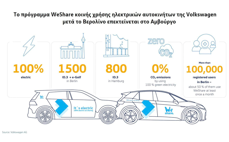 Η Volkswagen ξεκίνησε πιλοτικό πρόγραμμα car sharing, κοινής χρήσης ηλεκτρικών αυτοκινήτων, στο Αμβούργο. Πρόκειται για τη δεύτερη μεγαλούπολη της Γερμανίας στην οποία η VW υλοποιεί τo πρόγραμμα, με την ονομασία «WeShare», μετά το Βερολίνο, στο οποίο ξεκίνησε το 2019.