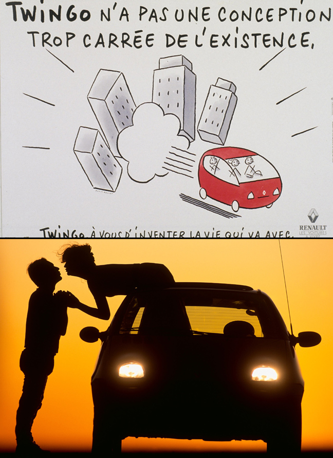 Σε αυτή την εποχή, έρχεται το Twingo, ένα τελείως πρωτότυπο αυτοκίνητο που τάραξε τα νερά της αυτοκινητοβιομηχανίας. Λανσαρίστηκε με έναν τύπο κινητήρα, ένα επίπεδο εξοπλισμού και τέσσερα ζωηρά χρώματα, κάνοντας τον κόσμο να χαμογελάσει ακόμη και χάρη στο όνομά του, ένα συνδυασμό των λέξεων «twist» «swing» και «tango» που όλες παραπέμπουν σε είδη χορού.