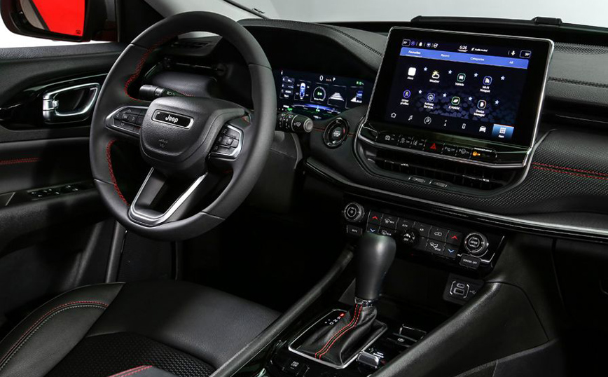 Το εντελώς νέο εσωτερικό διαθέτει κομψότητα, φινέτσα και τεχνολογία. Όλα τα στοιχεία προσαρμόστηκαν ώστε να προσφέρουν άνεση κάνοντας ευχάριστες τις καθημερινές διαδρομές, αλλά και τις μεγάλες αποδράσεις εντός ή εκτός δρόμου. Οι καθαρές γραμμές και η σωστή επιλογή υλικών συμβάλουν στη δημιουργία ενός κομψού εσωτερικού που αποπνέει ποιότητα και διακριτική πολυτέλεια. Η αναβαθμισμένη εργονομία και ο σύγχρονος σχεδιασμός, συνδυάζονται με το πλέον προηγμένο σύστημα πολυμέσων UConnect 5, το οποίο -εκτός των άλλων- προσφέρει ασύρματη λειτουργία mirroring με συσκευές κινητών τηλεφώνων, ταυτόχρονη σύνδεση δύο συσκευών, αλλά και συμβατότητα με δίκτυα 5G. Στο νέο Compass διαθέσιμος είναι για τον οδηγό ένας πλήρως ψηφιακός πίνακας οργάνων με οθόνη υψηλής ανάλυσης 10,25’’, ενώ το σύστημα UConnect 5 συνδυάζεται (ανάλογα με την έκδοση) με οθόνες αφής από 8,4 έως και 10,1 ίντσες.