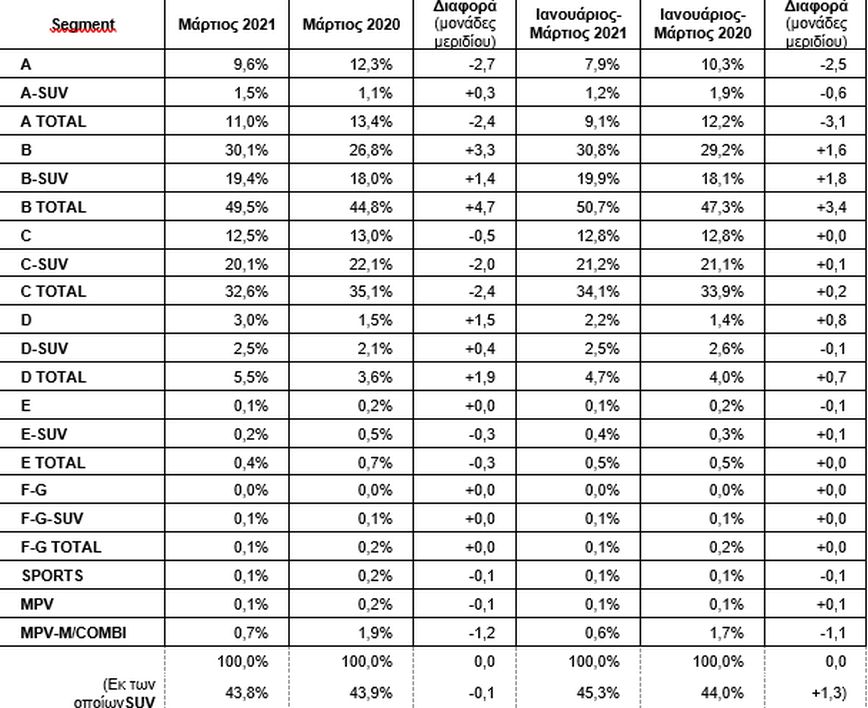 Επίσης, σύμφωνα με πρώτους υπολογισμούς, η πρόοδος στις κατηγορίες των επιβατικών, εως τον Μάρτιο, έχει ως εξής: