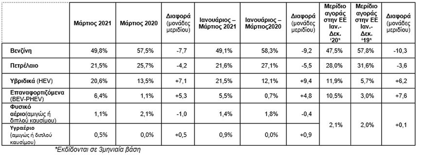 Σημαντικές οι αλλαγές όσον αφορά το καύσιμο που χρησιμοποιούν τα αυτοκίνητα που πουλήθηκαν στο Α΄τρίμηνο του 2021, καθώς οι θερμικοί κινητήρες υποχωρούν, ενώ τα υβριδικά διπλασίασαν το ποσοστό τους (21,5% της αγοράς) και τα plug-in υβριδικά μαζί με τα αμιγώς ηλεκτρικά 8πλασίασαν το ποσοστό τους φθάνοντας το 5,5%, την ώρα που οι κινητήρες με αέριο υποχώρησαν κατά 0,4%. Πιο αναλυτικά, η αγορά ανά τύπο καυσίμου έχει ως εξής: