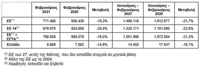 Σε επίπεδο ΕΕ, με βάση τα στοιχεία του Ευρωπαϊκού Συνδέσμου Κατασκευαστών Αυτοκινήτων (www.acea.be), η αγορά των επιβατικών κινήθηκε και τον Φεβρουάριο πτωτικά, γεγονός που κρατά περίπου στο 20% την μείωση πωλήσεων του Α΄ τριμήνου σε σχέση με αυτό του προηγούμενου έτους. Πιο αναλυτικά, η αγορά στις χώρες της ΕΕ κινήθηκε ως εξής: