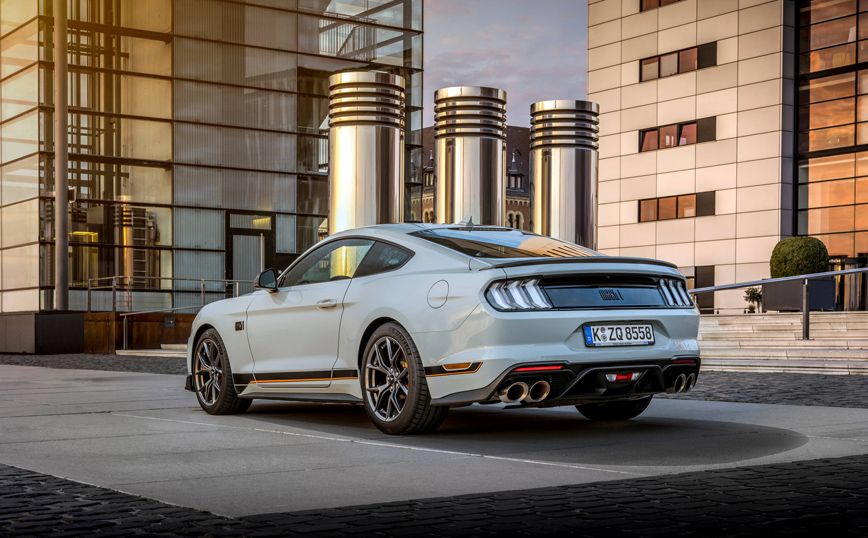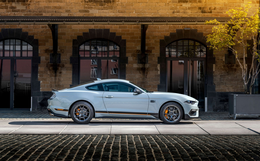Η νέα Mustang Mach 1 εξοπλίζεται με ζάντες αλουμινίου με 5 μπράτσα, διάμετρο 19 ίντσες και μεγαλύτερο κατά 0,5 ίντσες πλάτος εμπρός και πίσω, οι οποίες συνδυάζονται με ελαστικά Michelin Pilot Sport 4 που μπορούν να χρησιμοποιηθούν σε πίστα.
