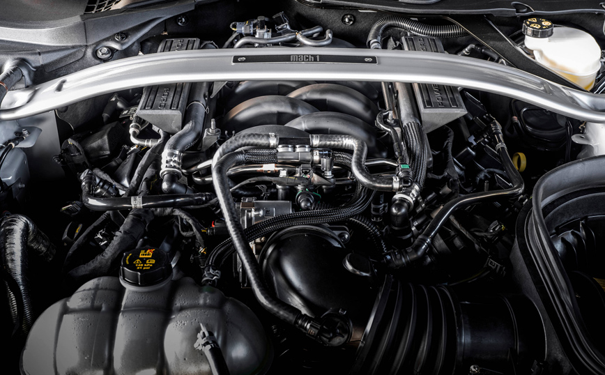 Η νέα Mustang Mach 1 είναι η πιο οδηγοκεντρική έκδοση παραγωγής του εμβληματικού σπορ μοντέλου της Ford που φιλοξενεί μία τροποποιημένη έκδοση του 5λιτρου, αλουμινένιουV8 βενζινοκινητήρα της εταιρείας. Με φιλτροχωάνη ανοιχτού τύπου (Open Air Induction System), πολλαπλή εξαγωγής και πεταλούδα 87 χλστ από την Mustang Shelby GT 350 που διατίθεται στην Β. Αμερική, αυξάνεται η ελεύθερη ροή αέρα στον κινητήρα, ο οποίος αποδίδει μέγιστη ισχύ 460 ίππων στις 7.500 σ.α.λ και η ροπή 529 Nm στις 4.600 σ.α.λ. Την ίδια στιγμή η βελτιωμένη αναπνοή του V8 λειτουργεί σε συνεργασία με το αναβαθμισμένο λογισμικό διαχείρισης του κινητήρα και έναν συνδυασμό έμμεσου και άμεσου ψεκασμού χαμηλής και υψηλής πίεσης του καυσίμου αντίστοιχα για καλύτερη ευστροφία (η κόκκινη περιοχή του στροφόμετρου ξεκινά στις 7.500 σ.α.λ.).