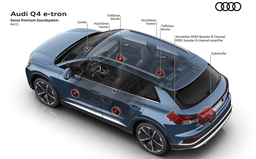 Τα Q4 e-tron και Q4 Sportback e-tron διαθέτουν πακέτο ενημέρωσης/ψυχαγωγίας δομημένο σε τρία επίπεδα – από MMI σε MMI plus έως MMI pro. Διατίθενται διάφορες λειτουργίες ανάλογα με το επίπεδο διαμόρφωσης, συμπεριλαμβανομένης της head-up οθόνης επαυξημένης πραγματικότητας και του Audi virtual cockpit plus. Τα προαιρετικά επίπεδα παρέχουν τις διαδικτυακές υπηρεσίες του Audi connect, συμπεριλαμβανομένου του έξυπνου σχεδιασμού διαδρομών e-tron για την επεξεργασία της βέλτιστης διαδρομής που λαμβάνει υπ’ όψη της τη δημόσια υποδομή φόρτισης. Για premium ήχο, φροντίζει ένας νέος συνεργάτης ιδιαίτερα δημοφιλής στη νέες γενιές φίλων του ήχου υψηλής πιστότητας – το ηχοσύστημα της Sonos που συνδυάζει το lifestyle, την τεχνολογία και το design σε μια νέα διάσταση.