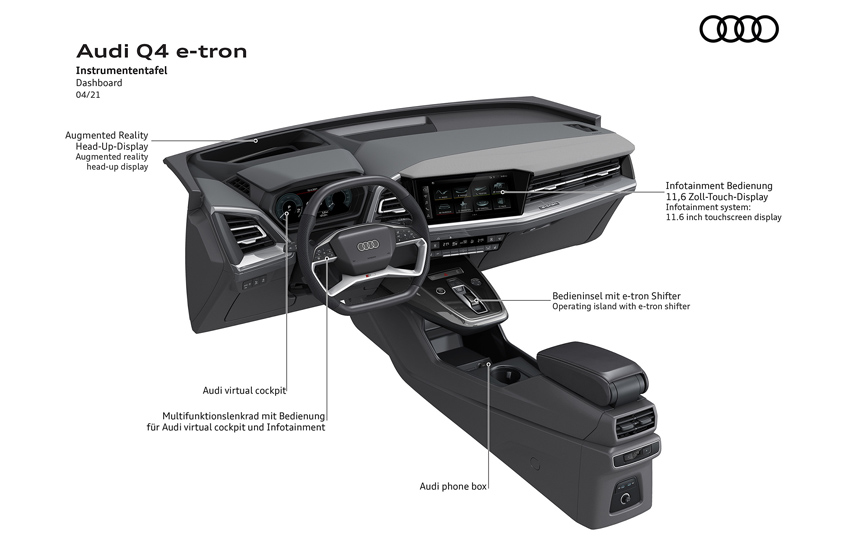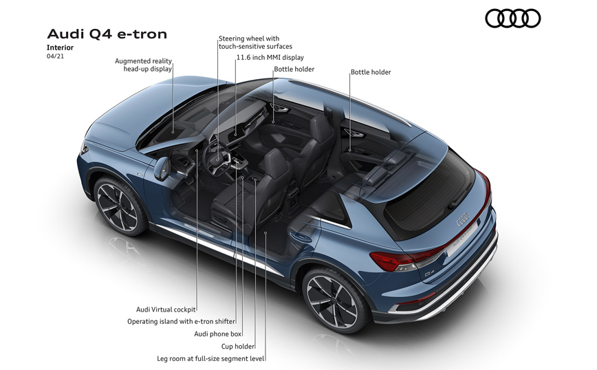 Εντυπωσιακά στην όψη και την αίσθηση, ευρύχωρα και με πρωτοποριακές λύσεις στον έλεγχο, τον χειρισμό, τις οθόνες και τα συστήματα υποβοήθησης οδηγού. Η head-up οθόνη επαυξημένης πραγματικότητας, συνδέει τον εικονικό με τον πραγματικό κόσμο με έναν εντελώς νέο τρόπο. Η γκάμα περιλαμβάνει τρεις εκδόσεις κινητήριου συστήματος, με επικεφαλής ένα μοντέλο quattro με μέγιστη ισχύ 299 ίππους. Χρόνος φόρτισης περίπου δέκα λεπτών παρέχει αρκετή ενέργεια για κάλυψη περίπου 130 χιλιομέτρων (WLTP). Το πισωκίνητο Q4 40 e-tron επιτυγχάνει αυτονομία έως και 520 χιλιόμετρα στον κύκλο WLTP. Οι πωλήσεις του μοντέλου στην Ευρώπη ξεκινούν το καλοκαίρι.
