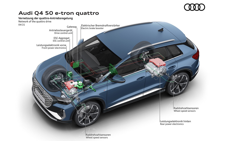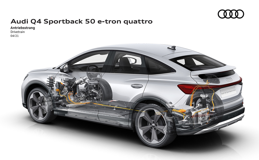 Το Q4 35 e-tron και το Q4 40 e-tron έχουν έναν ηλεκτροκινητήρα που κινεί τους πίσω τροχούς, με έξοδο 170 και 204 ίππων αντίστοιχα. Η κορυφαία έκδοση Q4 50 e-tron quattro έχει δύο ηλεκτροκινητήρες για την ηλεκτρική τετρακίνηση quattro. Προσφέρουν μέγιστη ισχύ 299 ίππων, η οποία εξασφαλίζει επιτάχυνση 0-100 χλμ./ώρα σε μόλις 6,2 δευτερόλεπτα και ηλεκτρονικά περιορισμένη τελική ταχύτητα 180 χλμ./ώρα. Για μεγαλύτερο βαθμό ενεργειακής απόδοσης, ο κινητήρας στον μπροστινό άξονα ενεργοποιείται μόνο όταν απαιτείται υψηλή ισχύς ή ισχυρή πρόσφυση. Ένας άλλος σημαντικός παράγοντας στην εξοικονόμηση ενέργειας κατά την οδήγηση είναι η έξυπνη ανάκτηση, η οποία ενσωματώνει επίσης στοιχεία πλοήγησης και τοπογραφικά δεδομένα.