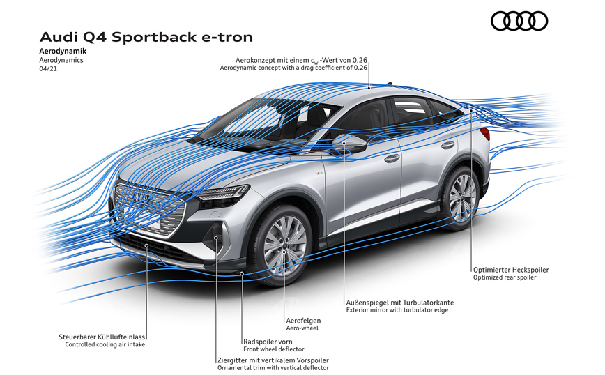 Η εμφάνιση χαρακτηρίζεται από εντυπωσιακές αναλογίες με κοντούς μπροστινούς πρόβολους, μεγάλους τροχούς και δυναμικές γραμμές. Στο Q4 Sportback e-tron, η ιδιαίτερα χαμηλή γραμμή οροφής με κουπέ σχήμα καταλήγει σε ένα σπορ πίσω μέρος, με την αεροτομή εδρασμένη βαθιά στο παράθυρο δύο τμημάτων. Ο προοδευτικός και σύγχρονος σχεδιασμός είναι τόσο λειτουργικός όσο και αεροδυναμικός καθώς το Q4 e-tron επιτυγχάνει συντελεστή οπισθέλκουσας Cd 0,28 ενώ το Sportback φτάνει σε ακόμη χαμηλότερη τιμή, με συντελεστή οπισθέλκουσας 0,26.