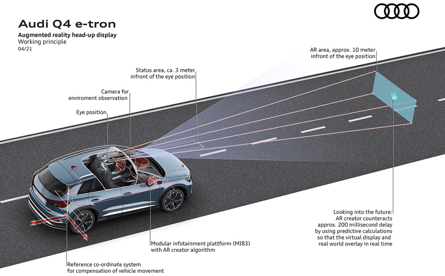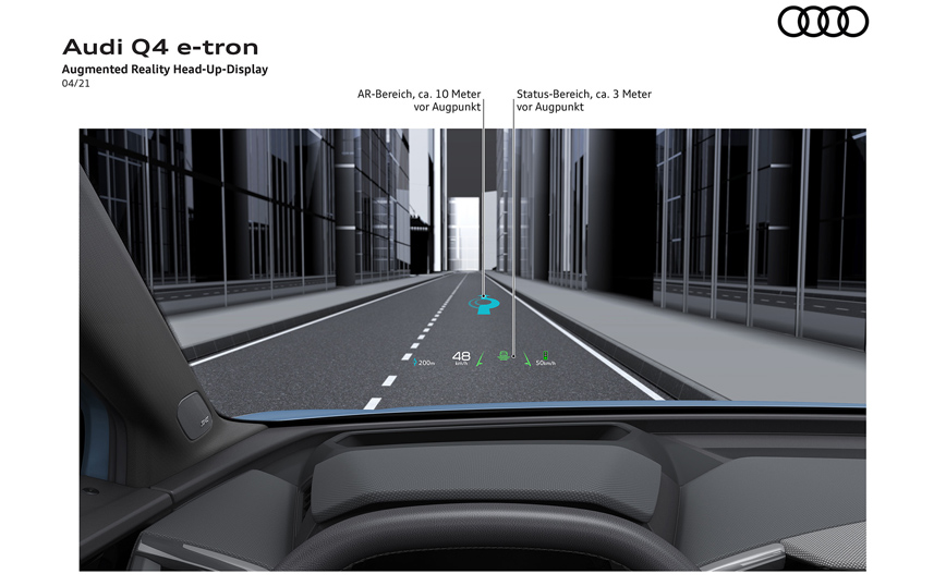Προαιρετικά, τα δυο ηλεκτρικά SUV μπορούν να εξοπλιστούν οθόνη head-up επαυξημένης πραγματικότητας. Αυτή προβάλλει τις πληροφορίες που παρέχονται από ορισμένα από τα συστήματα υποβοήθησης οδηγού και τα σύμβολα πλοήγησης στον πραγματικό εξωτερικό κόσμο, στο οπτικό πεδίο του οδηγού. Οι συγκεκριμένες πληροφορίες προβάλλονται δυναμικά σε έναν ευρύ χώρο, όπου εμφανίζονται ως μια αιωρούμενη εικόνα σε απόσταση περίπου δέκα μέτρων ή περισσότερο από τον οδηγό, δημιουργώντας ένα συναρπαστικό αποτέλεσμα.