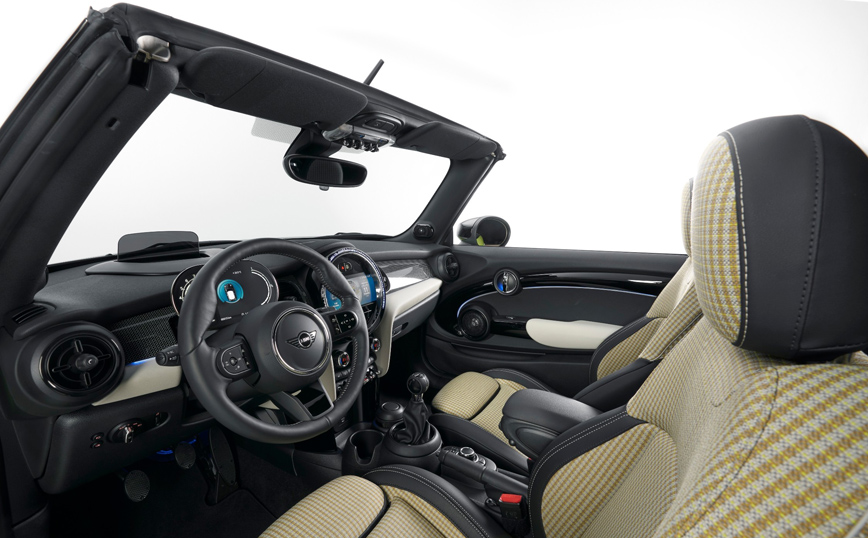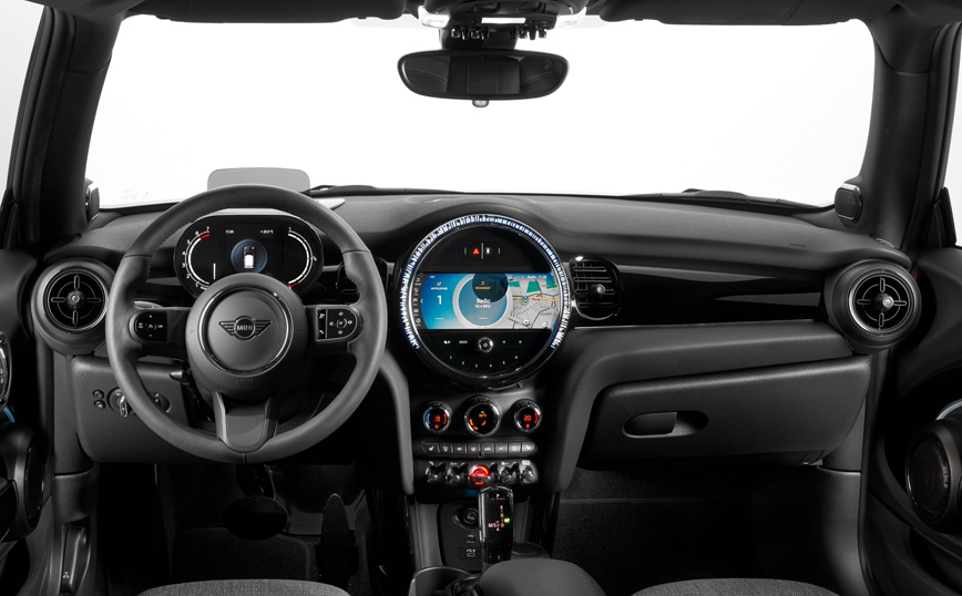 Στο εσωτερικό οι αεραγωγοί είναι ενσωματωμένοι στις επενδύσεις που είναι μεγαλύτερες με νέο σχεδιασμό. Επανασχεδιασμένο είναι το τιμόνι με διακόπτες ενσωματωμένους σε επίπεδη επιφάνεια, όπως επίσης και το κυκλικό βασικό όργανο αφής των 8.8 ιντσών. Στον βασικό εξοπλισμό έχουν προστεθεί και οι υπηρεσίες Mini Connected, που δίνουν στον οδηγό πολλές δυνατότητες επέμβασης από απόσταση. Οι υπηρεσίες αυτές που προσφέρονται με τη βοήθεια ειδικής εφαρμογής για κινητά τηλέφωνα, περιλαμβάνουν στοιχεία όπως κατάσταση οχήματος, ένδειξη καυσίμου, αυτονομία/επίπεδο φόρτισης μπαταρίας, θέση οχήματος, κλείδωμα, ξεκλείδωμα, αερισμό, ενεργοποίηση φώτων, αναβάθμιση software, ειδοποιήσεις και online ραντεβού για σέρβις, online οδηγό χρήσης του οχήματος, ιστορικό φόρτισης.