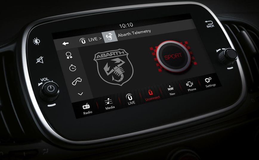 Χάρη στην τοποθέτηση του προηγμένου συστήματος πολυμέσων UConnect, με την οθόνη αφής HD των 7’’, στο βασικό εξοπλισμό όλων των εκδόσεων της νέας σειράς 595, τα μοντέλα διαθέτουν πλέον τη δυνατότητα να εξοπλιστούν με το σύστημα τηλεμετρίας Abarth Telemetry. Ουσιαστικά πρόκειται για ένα σύστημα (ιδανικό για τη χρήση σε πίστα) το οποίο μετρά σε πραγματικό χρόνο, καταγράφει και αναλύσει τα στοιχεία απόδοσης του αυτοκινήτου και του οδηγού.