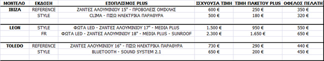 Τα πακέτα «Plus» είναι διαθέσιμα για τα βασικά μοντέλα της γκάμας Seat, βασίζονται στις πιο εμπορικές εκδόσεις και προσφέρουν σημαντικά αναβαθμισμένο εξοπλισμό σε ασύγκριτα ανταγωνιστικές τιμές.