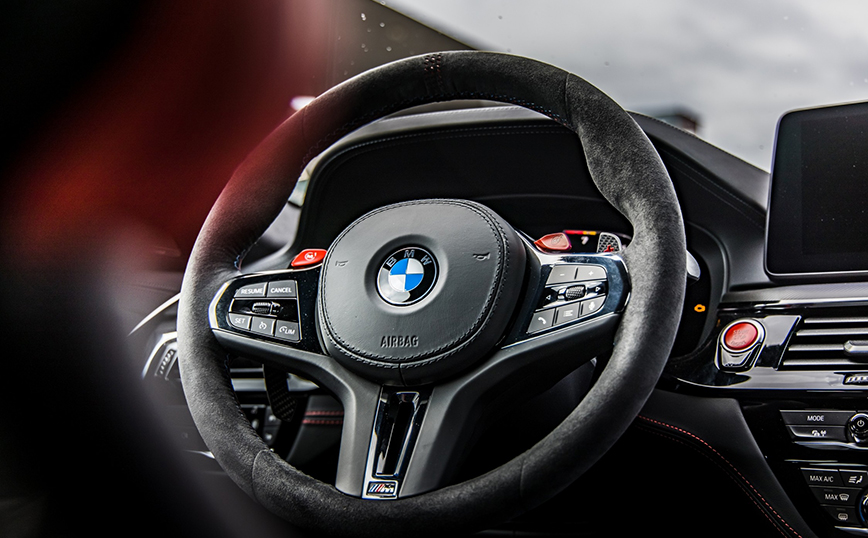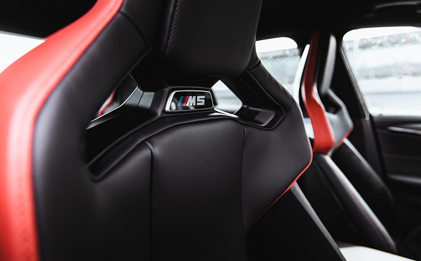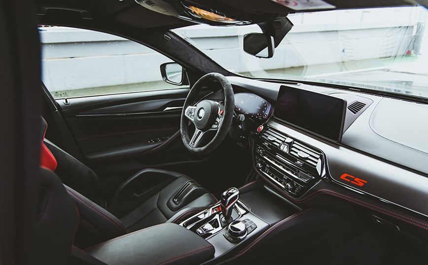Η M5 CS είναι ιδανική για ταξίδια με 4 επιβάτες, με οδηγό και συνοδηγό σε καθίσματα M Carbon και τους άλλους δύο επιβάτες σε ατομικά πίσω καθίσματα. Τα ενσωματωμένα προσκέφαλα (με φωτιζόμενα λογότυπα M5 για τα εμπρός καθίσματα) απεικονίζουν την χάραξη της θρυλικής πίστας του Nürburgring και το τιμόνι M Alcantara διαθέτει κόκκινη ένδειξη της ευθείας πορείας. Τα χειριστήρια αλλαγών σχέσεων (gearshift paddles) κατασκευάζονται από ανθρακονήματα. Το μεταλλικό χρώμα Frozen Deep Green του αυτοκινήτου που προορίζεται για το νικητή αναβάτη είναι ίδιο με το βασικό χρωματισμό του M5 CS MotoGP safety car.
