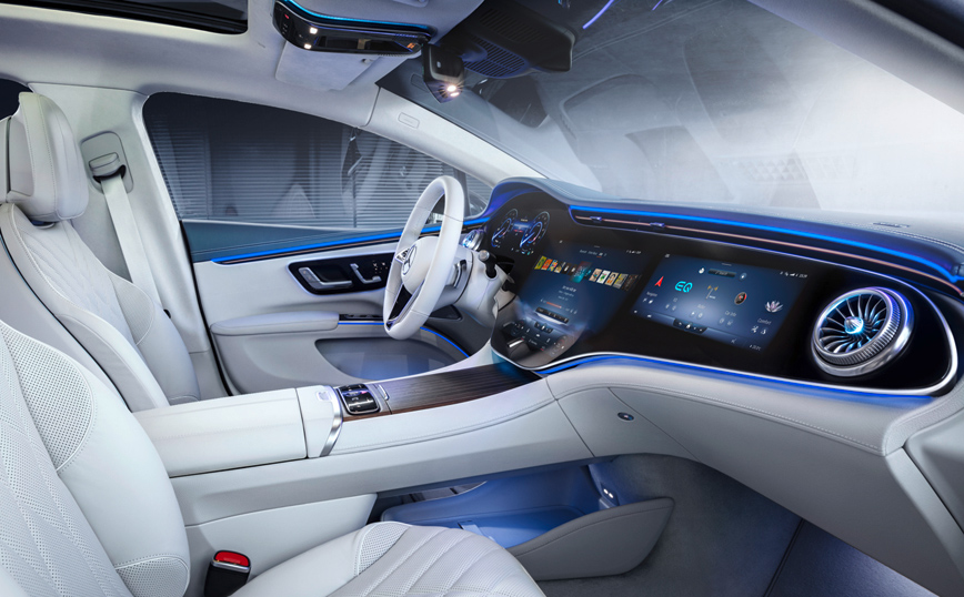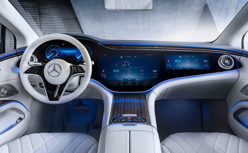 Η EQS είναι ένα εξαιρετικά «ευφυές» αυτοκίνητο με έως 350 αισθητήρες, ανάλογα με το επίπεδο εξοπλισμού. Οι αισθητήρες αυτοί καταγράφουν αποστάσεις, ταχύτητες και επιταχύνσεις, συνθήκες φωτισμού, βροχόπτωση και θερμοκρασίες, χρήση των καθισμάτων καθώς και το βλέμμα του οδηγού ή την ομιλία των επιβατών. Αυτή η πληθώρα πληροφοριών κατευθύνεται σε εγκεφάλους, οι οποίοι τις επεξεργάζονται με τη βοήθεια αλγορίθμων και λαμβάνουν αποφάσεις με αστραπιαία ταχύτητα. Συνεπώς, αποτελούν το «μυαλό» κατά κάποιον τρόπο, που μπορεί να επεκτείνει τις δυνατότητές του οχήματος με βάση νέες εμπειρίες, επειδή μπορεί να μαθαίνει χάρη στην τεχνητή νοημοσύνη (AI).