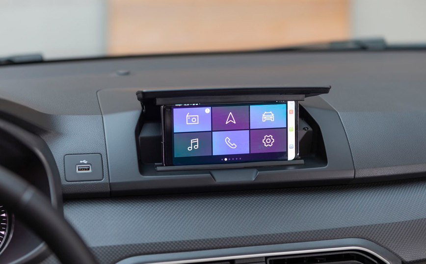 - Media Control: το smartphone μπορεί να τοποθετηθεί σε αφαιρούμενη βάση στο κέντρο του ταμπλό και να γίνει ένα ολοκληρωμένο σύστημα πολυμέσων μέσω της νέας δωρεάν εφαρμογής Dacia Media Control, συνδεόμενο μέσω Bluetooth ή θύρας USB.