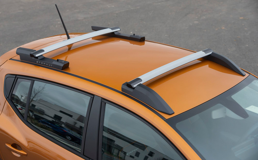 Οι χειρολαβές των θυρών έχουν εργονομικό σχήμα με την 5η πόρτα να διατίθεται και ηλεκτρικά ανοιγόμενη. Επίσης, το νέο σχήμα των θυρών και των πλευρικών καθρεφτών συμβάλλει στη βελτίωση της αεροδυναμικής του αυτοκινήτου, ενώ περιορίζει και τους αεροδυναμικούς θορύβους ώστε να μην ενοχλούν τους επιβάτες. - Το νέο Sandero Stepway είναι άμεσα αναγνωρίσιμο στο εμπρός μέρος από το ειδικά σχεδιασμένο, ανάγλυφο εμπρός καπό με τα τονισμένα τόξα, το χρωμιωμένο λογότυπο “Stepway” κάτω από τη γρίλια της μάσκας, καθώς και τα διακοσμητικά γύρω από τους προβολείς ομίχλης. Τόσο ο εμπρός όσο και ο πίσω προφυλακτήρας ενσωματώνουν μία μεταλλική ποδιά βαμμένη στο χρώμα του αμαξώματος, για προστασία από γδαρσίματα, ενώ το αμάξωμα Το νέο μοντέλο διαθέτει τις σχεδιαστικές λεπτομέρειες ενός crossover, όπως η αυξημένη απόσταση από το έδαφος στα 174 χλστ. (4,1 εκ. παραπάνω από του νέου Streetway), οι ράγες οροφής με το λογότυπο του μοντέλου, τα φαρδύτερα φρύδια στα φτερά και οι ειδικές ενισχύσεις στα μαρσπιέ των θυρών. Οι ράγες οροφής είναι ιδιαίτερα πρακτικές, καθώς έχουν τη δυνατότητα «μεταμόρφωσης» και με την βοήθεια ενός κλειδιού που βρίσκεται στο ντουλαπάκι του συνοδηγού, μπορούν να αποσυναρμολογηθούν σε δευτερόλεπτα και να μετατραπούν σε σχάρα οροφής με ικανότητα μεταφοράς αποσκευών βάρους έως και 80 κιλών, όπως οι κανονικές μπάρες μεταφοράς.