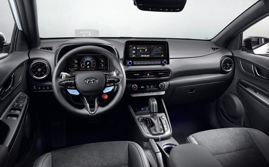 Το Kona N είναι εξοπλισμένο με ένα νέο σύστημα πολυμέσων 10,25 ιντσών και ψηφιακό πίνακα οργάνων επίσης 10,25 ιντσών. Διαθέτει μια αποκλειστική οθόνη head-up racing (HUD) που προσθέτει μια νέα διάσταση, όπως ένα παιχνίδι μέσα από τις εντυπωσιακές λειτουργίες N ή Sport. Ο νέος σχεδιασμός «N mode» του συστήματος πολυμέσων που προσφέρει μια gaming εμπειρία με ψηφιοποιημένα στοιχεία, παρέχει διάφορες πληροφορίες όπως ο χρόνος γύρου και οι χάρτες N track που βοηθούν στις καλύτερες «γραμμές» στις πίστες μαζί με άλλες πληροφορίες.