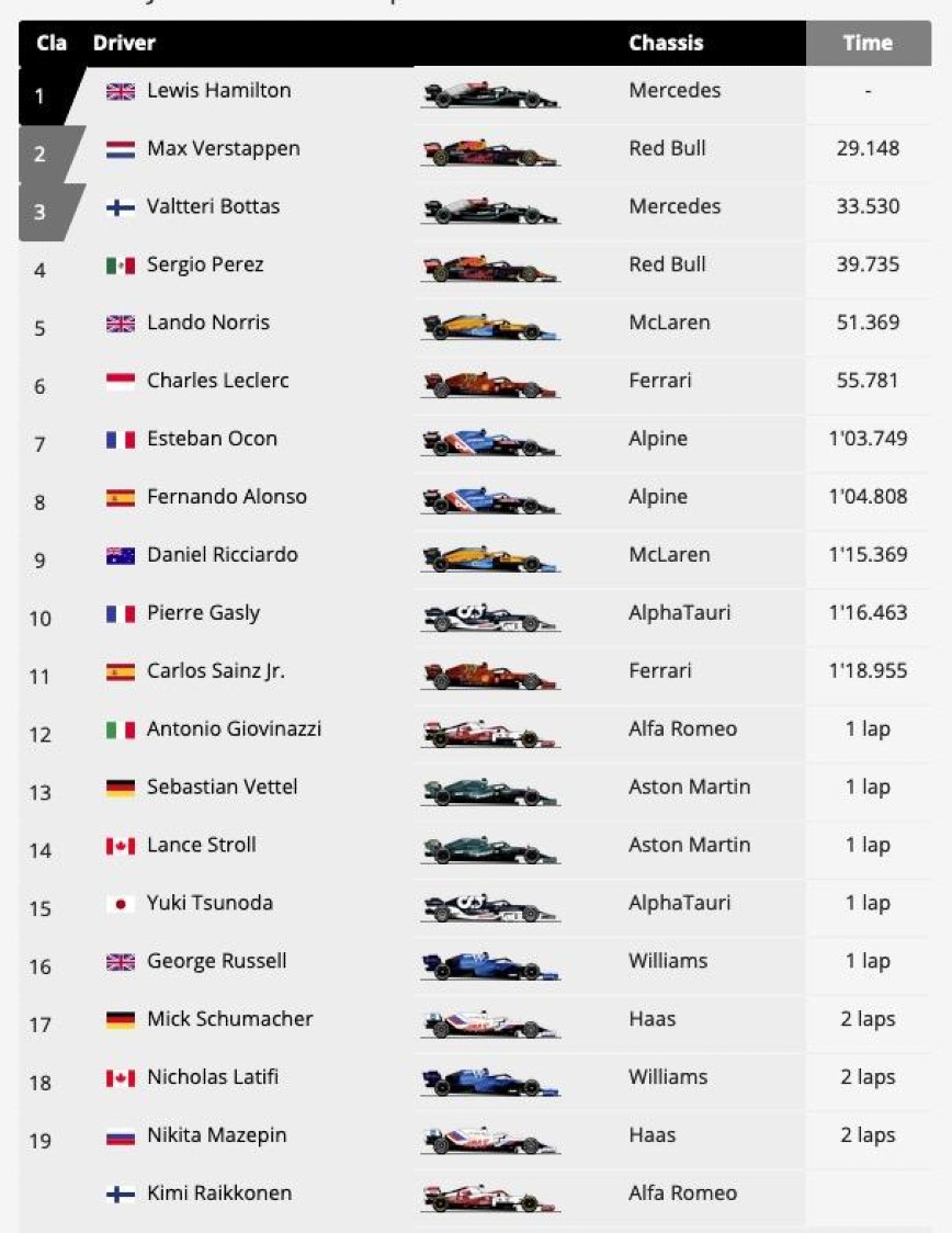 Ο παγκόσμιος πρωταθλητής είδε για 97η φορά στην καριέρα του -και δεύτερη φετινή σε τρεις αγώνες- πρώτος την καρό σημαία και επιβεβαίωσε ότι είναι και φέτος το φαβορί, αφήνοντας στη 2η θέση τον Φερστάπεν και στην 3η, τελικά, τον Μπότας.