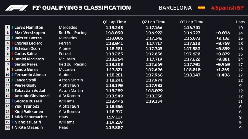 Πίσω του, στη 2η θέση, θα είναι ο Φερστάπεν με Red Bull και στην 3η ο Μπότας, ο έτερος οδηγός της Mercedes, ενώ ικανοποίηση επικρατεί και τη βελτιωμένη Ferrari για τις επιδόσεις των Λεκλέρ (θα ξεκινήσει από την 4η θέση) και Σάινθ (6η).
