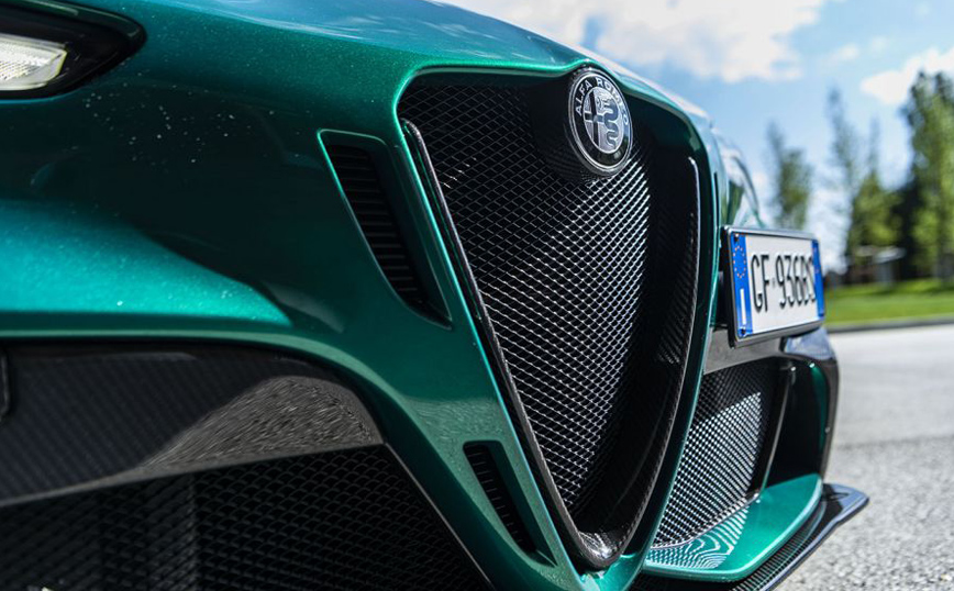 Οι νέες, μεγαλύτερες εισαγωγές αέρα και τα στοιχεία από ανθρακονήματα εκφράζουν την αυξημένη απόδοση του συνόλου, ενώ παράλληλα παίζουν και έναν ακριβή ρόλο σε τεχνικό επίπεδο. Ακόμα και το θρυλικό «Trilobo», η σύνθεση της τριγωνικής μάσκας και των εκατέρωθεν αυτής αεραγωγών, έχει γίνει πιο επιθετικό, χωρίς όμως να χάνει το DNA της μάρκας, όπως και οι μικρές εισαγωγές στη μάσκα που θυμίζουν τις αντίστοιχες που είχαν τα μονοθέσια της Alfa Romeo στη Formula 1 στις αρχές της δεκαετίας του 1950. Στο κάτω μέρος, το ενεργό σπόιλερ είναι ανασχεδιασμένο σε σχέση με την έκδοση Quadrifoglio και στην GTAm μπορεί να ρυθμιστεί ώστε να λειτουργεί σε ισορροπία με την πίσω μεγάλη αεροτομή, η οποία επίσης διαθέτει τέσσερις θέσεις ρύθμισης του κεντρικού τμήματος της.