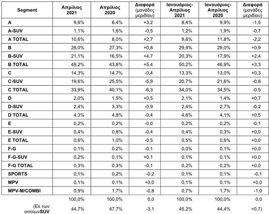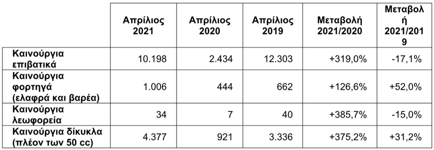 Σημείωσαν τεράστια αύξηση καθώς, σύμφωνα με την ΕΛΣΤΑΤ, κυκλοφόρησαν για πρώτη φορά 18.352 αυτοκίνητα (καινούργια ή μεταχειρισμένα εξωτερικού) έναντι 4.031 που κυκλοφόρησαν τον αντίστοιχο μήνα του 2020 (μείωση 80,6% είχε παρουσιαστεί τον Απρίλιο 2020 σε σχέση με τον αντίστοιχο μήνα του 2019). Τα καινούργια αυτοκίνητα ανέρχονται σε 11.069 έναντι 2.878 που τον Απρίλιο 2020, παρουσιάζοντας αύξηση 284,6%.
