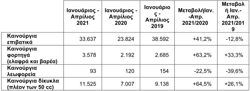 Το α’ τετράμηνο, κυκλοφόρησαν 12.961 νέες μοτοσικλέτες κυβισμού άνω των 50 cc (καινούργιες και μεταχειρισμένες εξωτερικού) έναντι 7.704 την αντίστοιχη περίοδο του 2020, παρουσιάζοντας αύξηση 64,7% (μείωση 24,5% είχε καταγραφεί το α’ τετράμηνο του 2020 σε σχέση με το αντίστοιχο του 2019). Οι καινούργιες μοτοσικλέτες ανέρχονται σε 11.470 έναντι 7.008 το α’ τετράμηνο του 2020, παρουσιάζοντας αύξηση 63,7%.