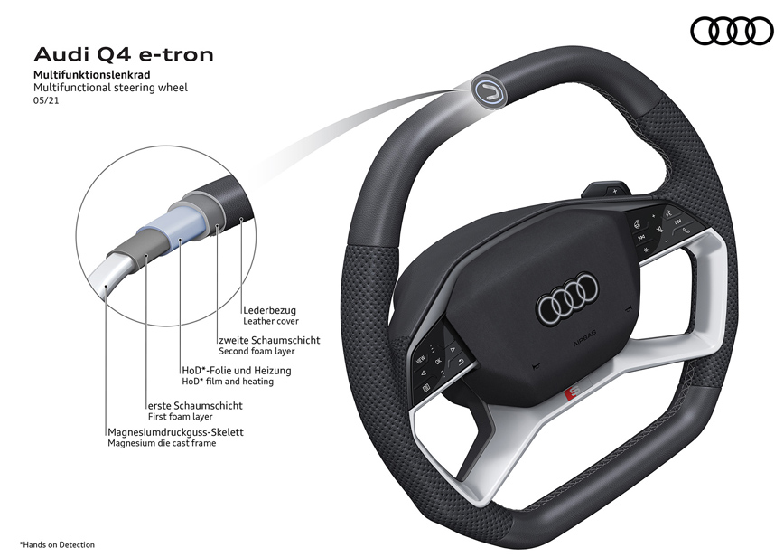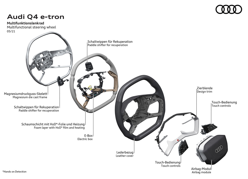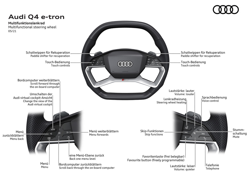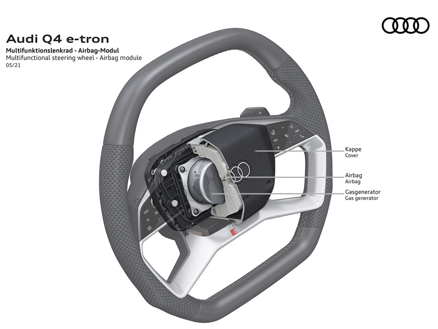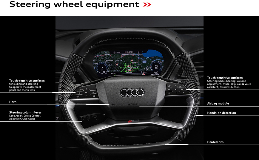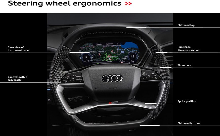 Το τιμόνι των Q4 e-tron και Q4 Sportback e-tron θέτει νέα πρότυπα στη σχεδίαση, την εργονομία και τη λειτουργικότητα. Ενσωματώνει συνολικά 18 λειτουργίες, οι οποίες μπορούν να χρησιμοποιηθούν για πρώτη φορά μέσω οθονών αφής με εμφάνιση black panel. Οι περιοχές λειτουργίας τους ανάβουν και δείχνουν ποια κουμπιά είναι ενεργά με αυτόν τον τρόπο. Όταν είναι ανενεργές, οι οθόνες αφής με γυαλιστερό μαύρο χρώμα είναι σχεδόν αόρατες. Τα τέσσερα δακτυλίδια του σήματος στον απορροφητή κρούσης έχουν ακόμα επίπεδη σχεδίαση, δηλαδή είναι δισδιάστατα.