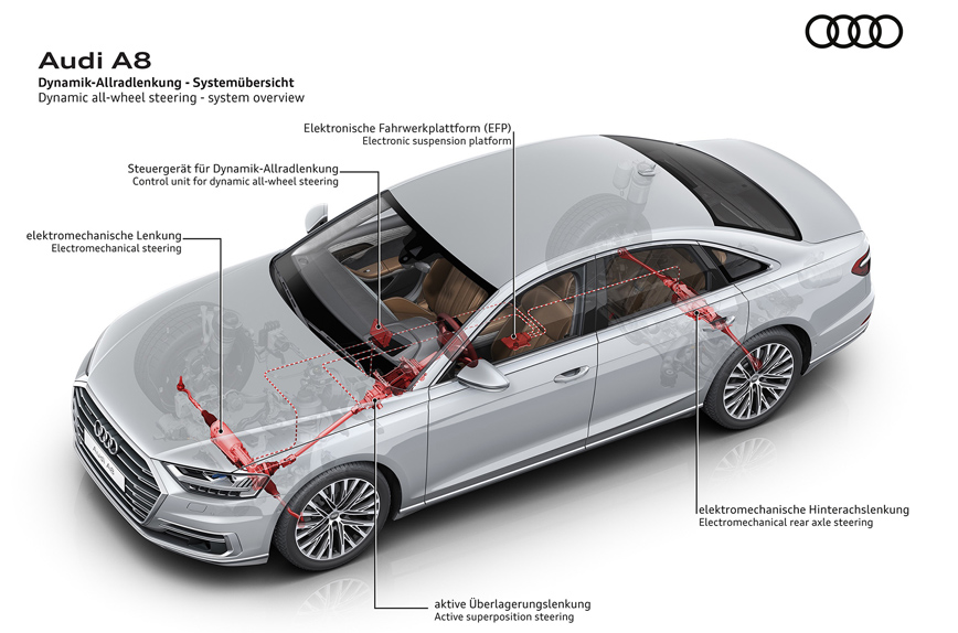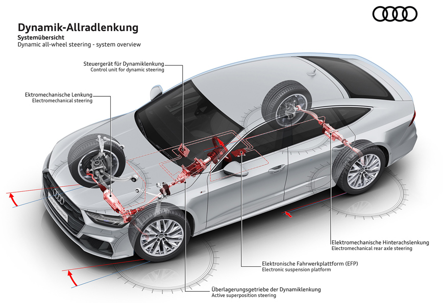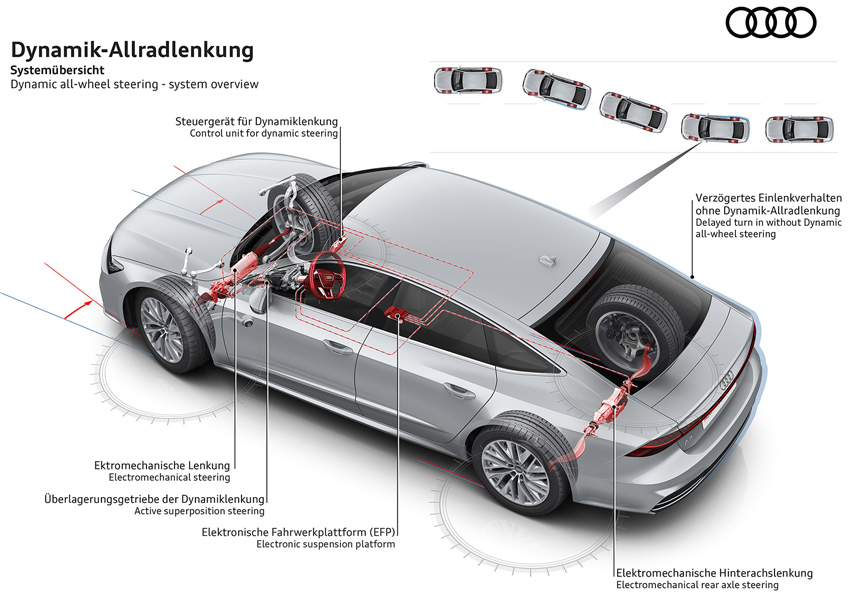 Μια πρόοδος στα συστήματα διεύθυνσης, είναι το Dynamic All-wheel Steering. Αυτή τη στιγμή είναι η κορυφαία τεχνολογία μεταξύ των συστημάτων διεύθυνσης της Audi και συνδυάζει δυναμικό σύστημα διεύθυνσης στον μπροστινό άξονα με σύστημα διεύθυνσης πίσω άξονα. Με αυτό το σύστημα, η μάρκα διερευνά τα όρια του φυσικού δυνατού. Το σύστημα προσφέρει σημαντικά οφέλη, ειδικά στο όριο. Συνδυάζει άμεση, σπορ απόκριση διεύθυνσης με σταθερότητα οδήγησης ή, εν συντομία: διαχείριση με εξαιρετικά υψηλή ακρίβεια. Ο λόγος του τιμονιού αλλάζει σε εύρος από 9,5 έως 17,0 – άμεσο σε χαμηλές ταχύτητες και σταθερό σε υψηλές ταχύτητες.