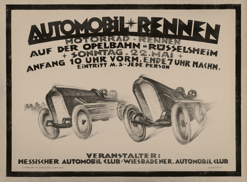 Πριν από 100 περίπου χρόνια έγιναν οι πρώτοι αγώνες αυτοκινήτων στην πίστα Opel Rennbahn. Αρκετοί διεκδικούν τον τίτλο του «1ου Αγώνα», αλλά πιο τεκμηριωμένο μέχρι σήμερα φαίνεται να είναι το «1. Wiesbadener Automobil-Turnier» (1ο Wiesbaden Automobile Tournament) που έλαβε χώρα 21-22 Μάϊου 1921. Χάρη στους λάτρεις της προσομείωσης και το internet, μπορούμε να αναβιώσουμε τη συγκίνηση αυτής της διοργάνωσης σήμερα.