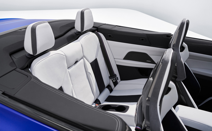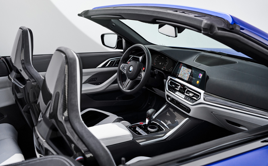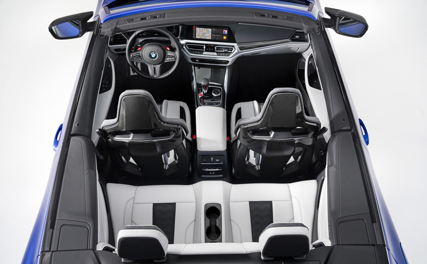 Το εσωτερικό της M4 Competition Cabrio με M xDrive συνδυάζει πολυτέλεια με αγωνιστική αίσθηση M. Το δερμάτινο τιμόνι M με χειριστήρια (paddles), επιλογέα ταχυτήτων M και κόκκινες πινελιές αυξάνουν την ένταση της οδηγικής εμπειρίας για τον οδηγό. Ηλεκτρικά ρυθμιζόμενα και θερμαινόμενα καθίσματα Μ Sport και δερμάτινη επένδυση Extended Merino προσφέρονται στάνταρ, ενώ θερμαντήρες λαιμού και εξαερισμός καθισμάτων διατίθενται προαιρετικά. Στην λίστα προαιρετικού εξοπλισμού περιλαμβάνονται τα νέα, θερμαινόμενα καθίσματα bucket M Carbon, που συνδυάζουν αγωνιστική λειτουργικότητα με ελαφριά δομή, εξαιρετική άνεση για μεγάλες αποστάσεις, πολυτέλεια και υψηλή ποιότητα κατασκευής.