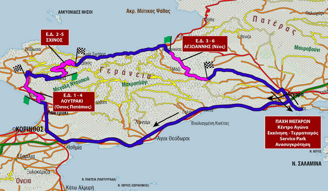 Η ολοκλήρωση του πρώτου σκέλους των Ειδικών Διαδρομών, θα βρει τα αγωνιστικά αυτοκίνητα στην Πάχη Μεγάρων για το μεσημεριανό σέρβις, πριν την επανάληψη των 3 Ειδικών Διαδρομών που προαναφέραμε, η οποία θα οδηγήσει και στον τερματισμό του αγώνα, μετά από 53,5 αγωνιστικά χιλιόμετρα.