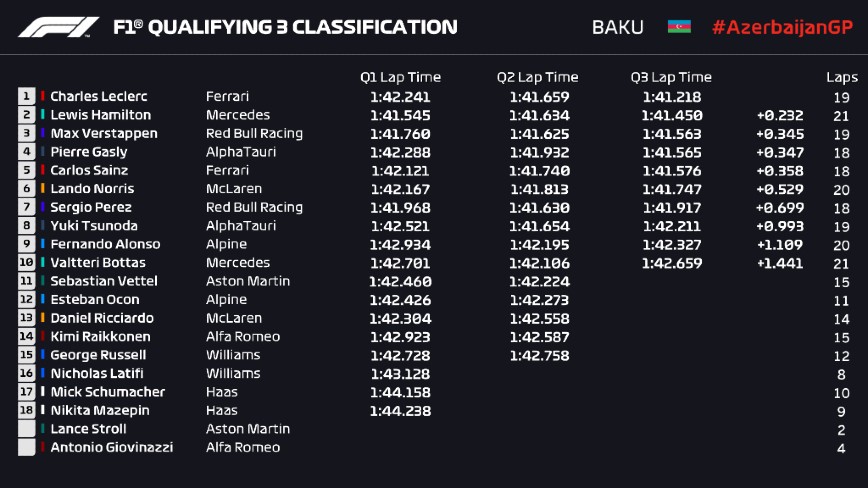 Γενικά οι κατατακτήριες δοκιμές στο Μπακού ήταν ένα… χάος, με τέσσερις κόκκινες σημαίες και με τον Λιούις Χάμιλτον να μην καταφέρνει κάτι καλύτερο από τη 2η θέση. Από την 3η θέση θα αρχίσει τον αγώνα της Κυριακής ο Μαξ Φερστάπεν με Red Bull ενώ την 4άδα κλείνει ο ο Πιέρ Γκασλί με Alpha Tauri.
