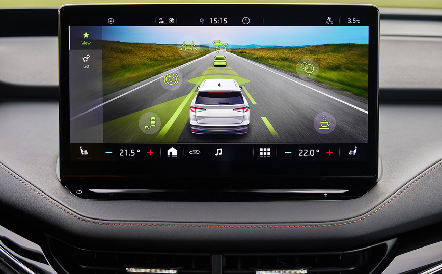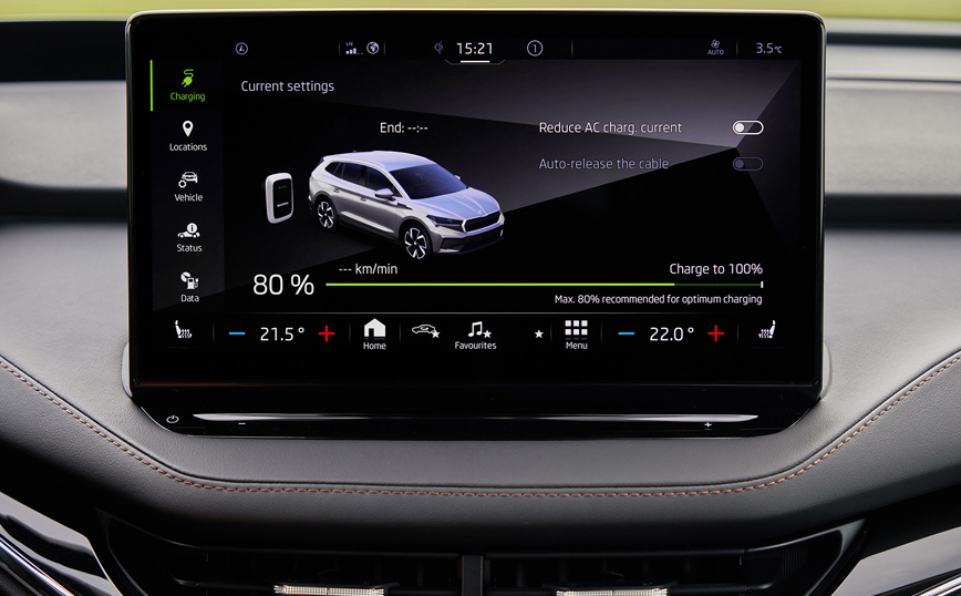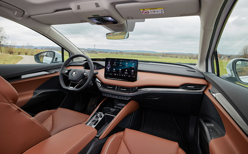Το κέντρο ελέγχου του οχήματος είναι η κεντρική οθόνη αφής η οποία έχει μέγεθος 13 ίντσες. Ο χειρισμός της γίνεται ανέπαφα, τόσο με κινήσεις των χεριών όσο και με φωνητικό έλεγχο μέσω του ψηφιακού βοηθού φωνής Laura. Επιπλέον, όχημα είναι πάντα συνδεδεμένο, ούτως ώστε η φόρτιση της μπαταρίας και ο κλιματισμός μπορούν να ελεγχθούν από απόσταση μέσω της εφαρμογής MySkoda.