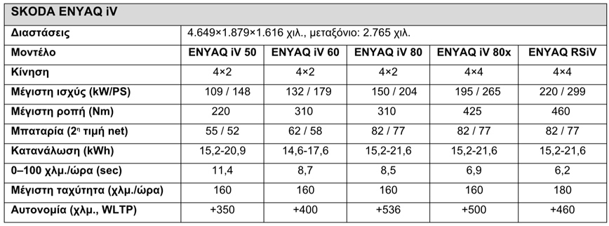 Το Enyaq iV βασίζεται στην ΜΕΒ, την αρθρωτή πλατφόρμα για την ηλεκτροκίνηση του VW Group, προσφέρει χώρους επιπέδου Kodiaq (το μεγάλο SUV της μάρκας), ηλεκτροκινητήρες με ισχύ από 148 έως 299 ίππους και αυτονομία έως 536 χιλιομέτρων (με την μεγαλύτερη από τις 3 μπαταρίες), ενώ η τιμή του διατηρείται κάτω από το «ψυχολογικό όριο» των 30.000 € (για την έκδοση με την μικρότερη μπαταρία), καθώς διαμορφώνεται στις 29.942 €, με την επιδότηση του προγράμματος «Κινούμαι Ηλεκτρικά».