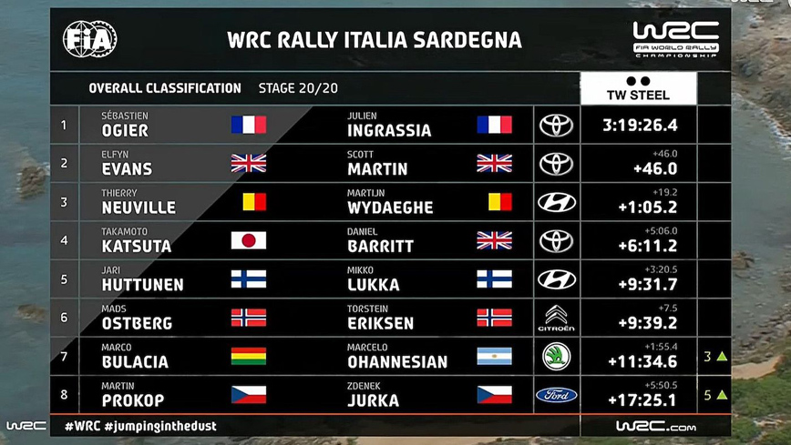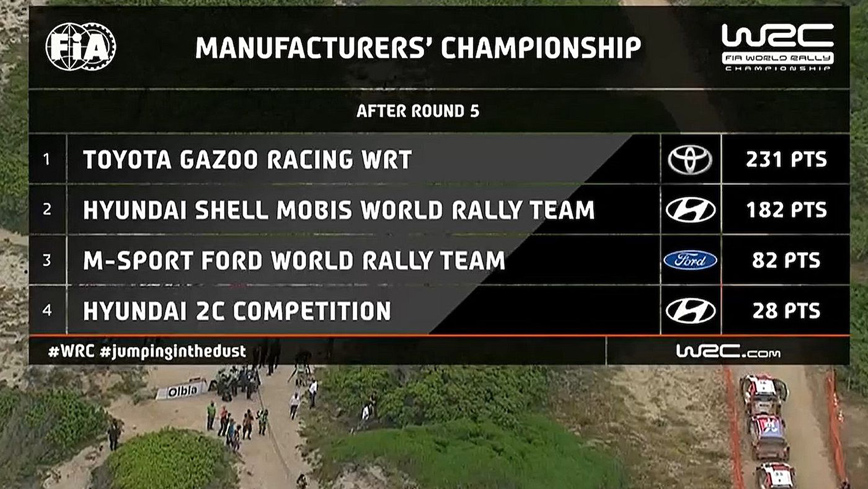 Κάπως έτσι και εν όψει του Ράλι Σαφάρι που θα γίνει στην Κένυα 24 έως 27 Ιουνίου, ο Οζιέ προηγείται με 106 βαθμούς στο πρωτάθλημα οδηγών, έχοντας στην 2η θέση «ασπίδα» τον ομόσταβλο του Έβανς με 95 β., ενώ ο Νεβίλ έχει μόλις 77 βαθμούς και απομακρύνεται για μια ακόμα χρονιά από τον τίτλο που τόσα χρόνια του «ξεφεύγει». Αντίστοιχα, στο πρωτάθλημα κατασκευαστών η Toyota ξέφυγε με 231 βαθμούς, έναντι 182 της Hyundai που απομακρύνεται από το «Three-peat».
