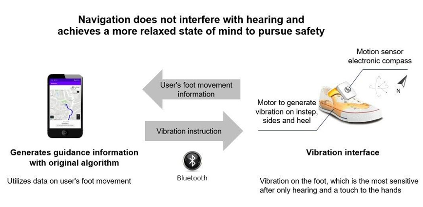 Όταν ο χρήστης πρέπει να κινηθεί ευθεία, παράγονται δονήσεις στο εμπρός τμήμα του πέλματος, ενώ όταν πλησιάζει σε μία δεξιά ή αριστερή στροφή οι δονήσεις παράγονται αντίστοιχα στη δεξιά ή την αριστερή πλευρά, για την προειδοποίηση του χρήστη.