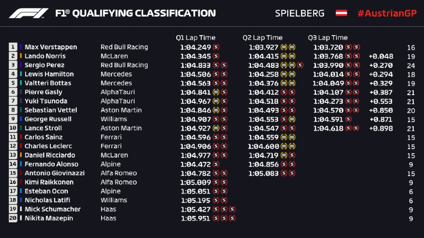 Ο οδηγός της Red Bull μετρούσε δύο συνεχόμενες pole positions και τις έκανε τρεις έχοντας τον πιο γρήγορο χρόνο και στην Αυστρία. Ο Φερστάπεν με 1:03:720 εξασφάλισε ότι την Κυριακή θα ξεκινήσει από την 1η θέση με στόχο ακόμη μία νίκη, η οποία θα του δώσει τη δυνατότητα να αυξήσει κι άλλο τη διαφορά από τον Λιούις Χάμιλτον.