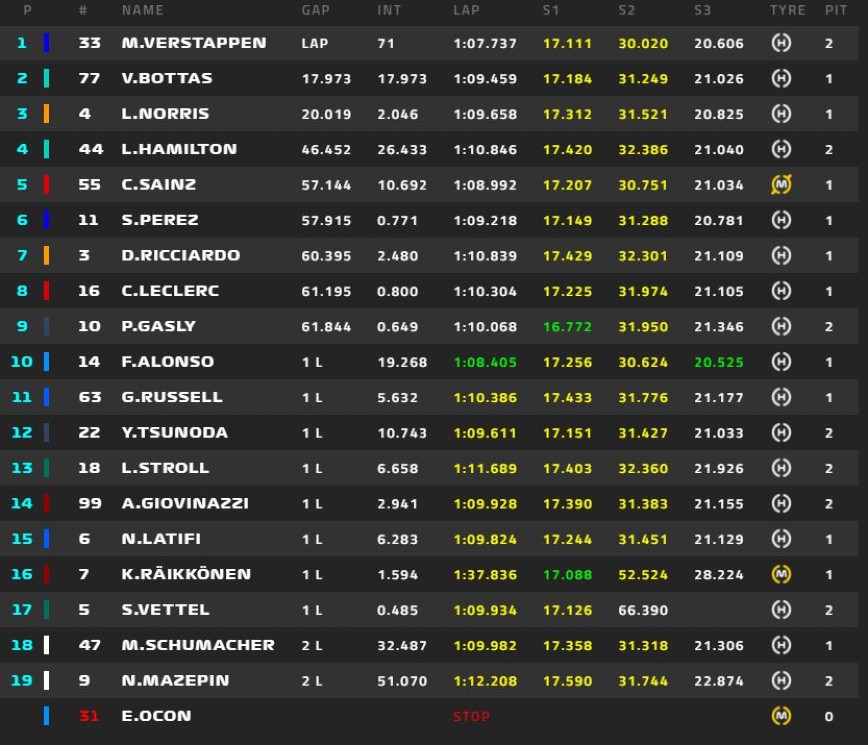 Και κυρίως από τον Χάμιλτον, ο οποίος ξεκίνησε από την 4η θέση και στην 4η τερμάτισε κιόλας. Μπροστά του, πλην του Φερστάπεν φυσικά, ήταν ο έτερος οδηγός της Mercedes, ο Μπότας, ο οποίος πήρε τη 2η θέση, ενώ την 3η την πήρε ο εκπληκτικός Νόρις.