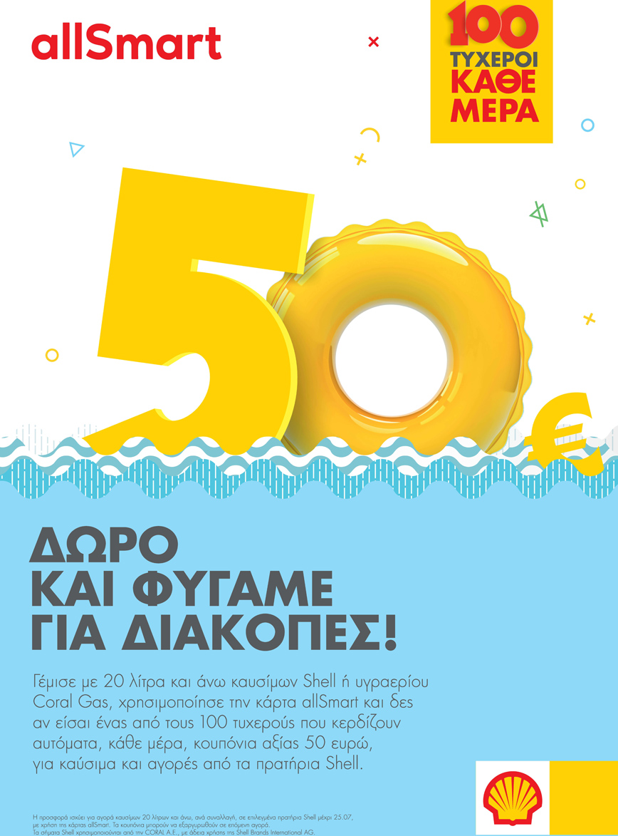 Η προωθητική ενέργεια ισχύει από 5 μέχρι και τις 25 Ιουλίου 2021 σε επιλεγμένα πρατήρια Shell με τη χρήση της κάρτας allSmart.