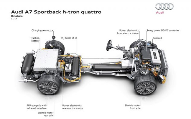 Όταν βρίσκεται στη λειτουργία κυψελών υδρογόνου, το Audi A7 h-tron quattro concept καταναλώνει περίπου ένα κιλό υδρογόνου ανά 100 χλμ., κάτι που αντιστοιχεί σε 3,7 λτ./100 χλμ. συμβατικού καυσίμου. Υπάρχουν 4 δεξαμενές υδρογόνου, οι οποίες εξασφαλίζουν στο πρωτότυπο όχημα αυτονομία άνω των 500 χλμ., ενώ όταν αυτές αδειάσουν, γεμίζουν σε τρία λεπτά.