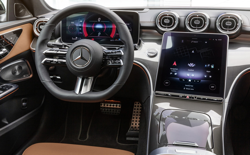 Η νέα C-Class είναι εξοπλισμένη με τη δεύτερη γενιά του MBUX (Mercedes-Benz User Experience). Το εσωτερικό του αυτοκινήτου έχει γίνει ακόμη πιο ψηφιακό και ευφυές, καθώς τόσο το hardware όσο και το λογισμικό έχουν κάνει άλματα προόδου. Επιπλέον, οι φωτεινές εικόνες των οθονών LCD διευκολύνουν τον έλεγχο των λειτουργιών οχήματος και ανέσεων, ενώ η απόκριση της οθόνης είναι ακόμη πιο γρήγορη από την προηγούμενη γενιά τηλεματικής, ακόμα και σε πολύ χαμηλές θερμοκρασίες.
