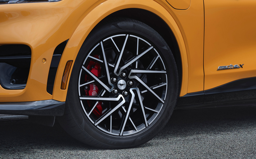 Οι προδιαγραφές φρένων και ελαστικών είναι επίσης ειδικές για το μοντέλο. Η Ford συνεργάστηκε με την Pirelli για τη δημιουργία μιας ειδικής γόμας και χάραξης πέλματος ελαστικών διαστάσεων 245/45 R20 υποστηρίζοντας έτσι την αυξημένη ροπή σε συνδυασμό με την τετρακίνηση του μοντέλου. Κατάλληλα για τροχούς πλάτους 8 ιντσών (1 ίντσα επιπλέον από τους τροχούς της στάνταρ Mustang Mach-E) τα μοναδικά αυτά ελαστικά παρέχουν εξαιρετική πρόσφυση και πλευρική ευστάθεια κατά τη σπορ οδήγηση. Τα αεριζόμενα εμπρός δισκόφρενα διαμέτρου 385 χλστ της Brembo με τα οποία εφοδιάζεται η Mustang Mach E GT είναι τα μεγαλύτερα σε σχέση με των άλλων Mustang Mach-E.