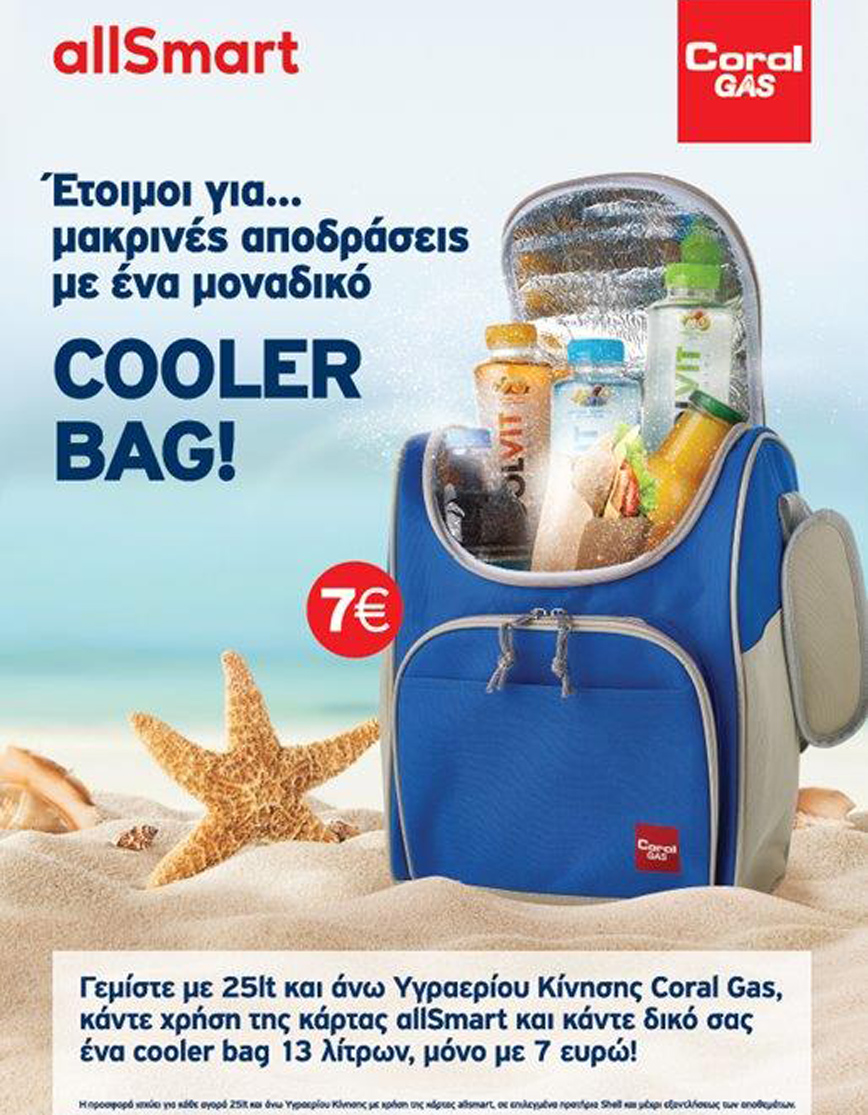 Συγκεκριμένα, κάθε φορά που οι καταναλωτές ανεφοδιάζουν το όχημά τους με τουλάχιστον 25 λίτρα υγραερίου κίνησης Coral Gas και κάνοντας χρήση της κάρτας allSmart, έχουν τη δυνατότητα να κάνουν δικό τους ένα Cooler Bag χωρητικότητας 13 λίτρων, με επιπλέον χρέωση μόλις 7€.