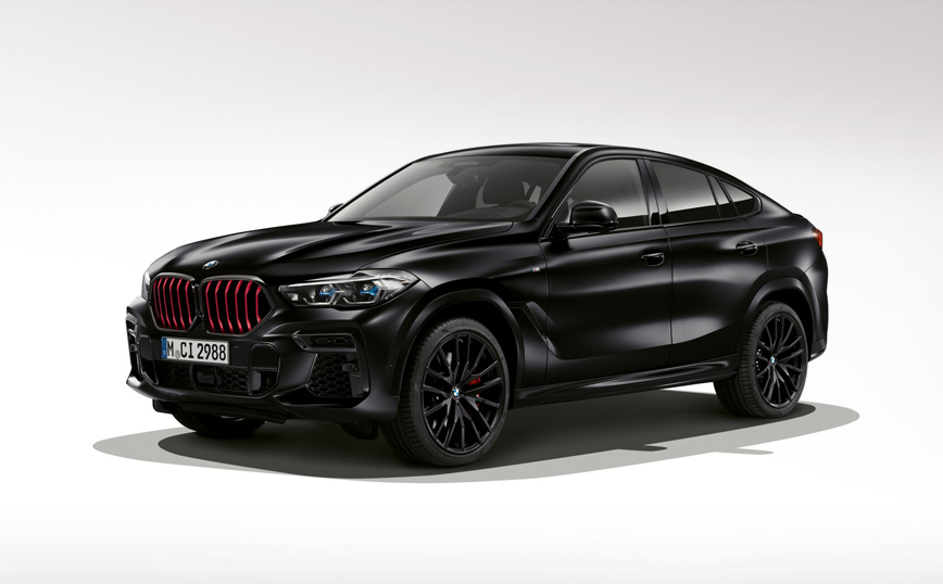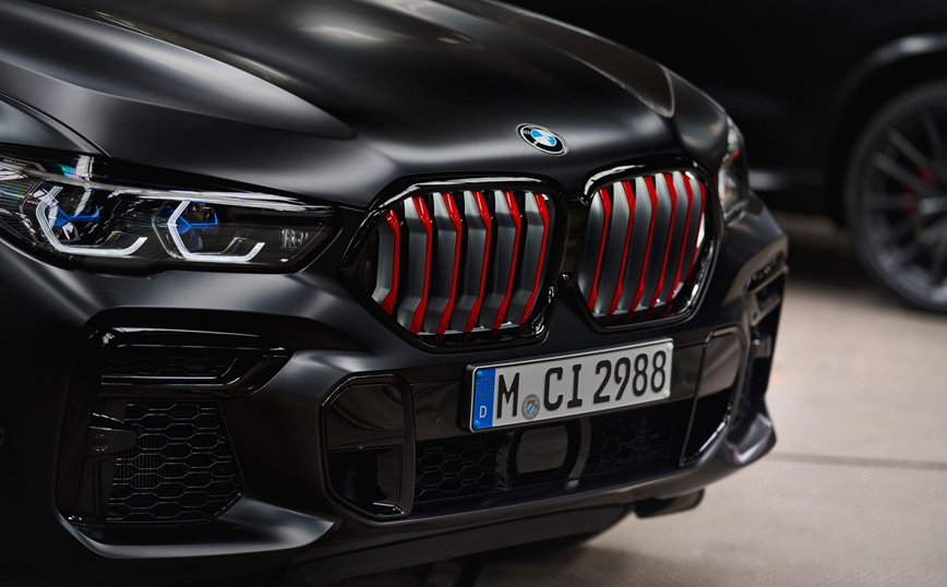 Στην X6 Black Vermilion αυτό το οπτικό στοιχείο εκφράζεται με εντυπωσιακό τρόπο σε συνδυασμό με το Iconic Glow της μάσκας. Οι προβολείς M Shadow Line με ισχυρό μπλε φως λέιζερ (laser light), ολοκληρώνουν τη χαρακτηριστική εμφάνιση του εμπρός τμήματος. Επιπλέον, στο εξωτερικό, το M Sport Package τονίζει τον σπορ χαρακτήρα των δυο εκδόσεων. Μεταξύ άλλων, διατίθενται με εμπρός και πίσω ποδιές και M high-gloss Shadow Line με δυνατότητες επέκτασης.