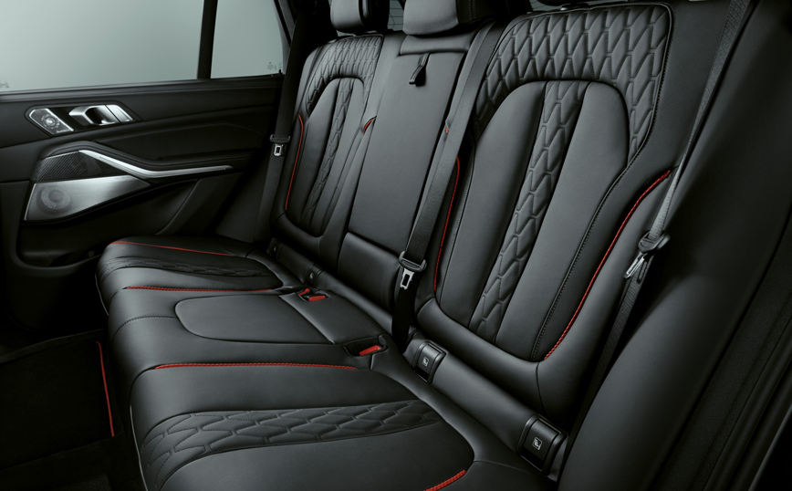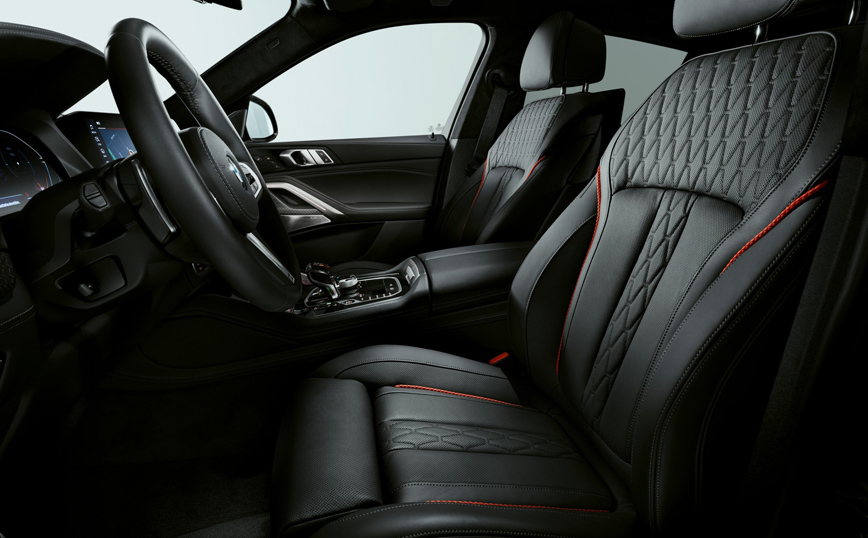 Οδηγός και συνοδηγός ταξιδεύουν σε άνετα καθίσματα με πολυάριθμες δυνατότητες ρύθμισης. Η πλήρως δερμάτινη επένδυση Merino Black της BMW Individual αναδεικνύεται με μία αποκλειστική κόκκινη ραφή στα καθίσματα οδηγού και συνοδηγού. Στο εσωτερικό της X5 Black Vermilion, η κόκκινη ραφή κοσμεί και τα πίσω καθίσματα.
