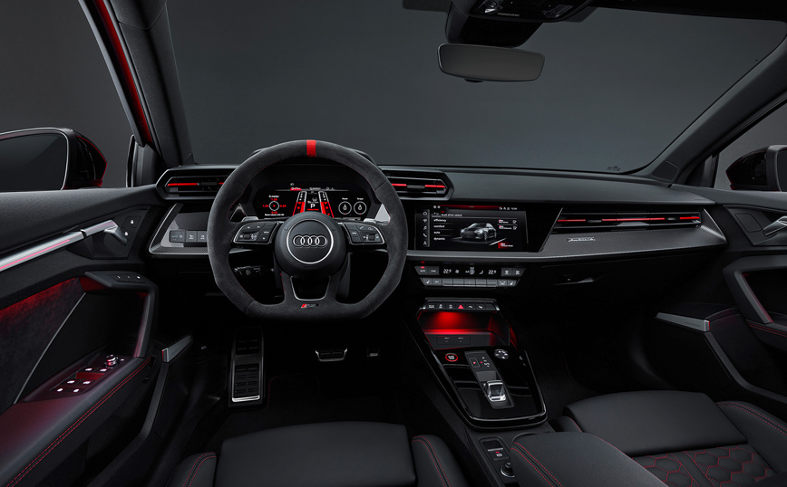 Το RS 3 είναι στάνταρ εξοπλισμένο με δερμάτινο τιμόνι RS Sport τριών ακτίνων με επίπεδη βάση, που διαθέτει ενσωματωμένα, υψηλής ποιότητας paddles από χυτοσίδηρο. Εναλλακτικά, διατίθεται στρογγυλό τιμόνι RS. Και τα δύο τιμόνια έχουν το νέο κουμπί RS Mode στα δεξιά τους. Αυτό το κουμπί μπορεί να χρησιμοποιηθεί για επιλογή των λειτουργιών drive RS Performance, RS Individual ή την πιο πρόσφατη λειτουργία που χρησιμοποιήθηκε. Και στις δύο λειτουργίες RS, η οθόνη των οργάνων και η head-upοθόνη έχουν μια ακόμη πιο σπορ εμφάνιση, με μια ένδειξη αλλαγής ταχύτητας που αναβοσβήνει.
