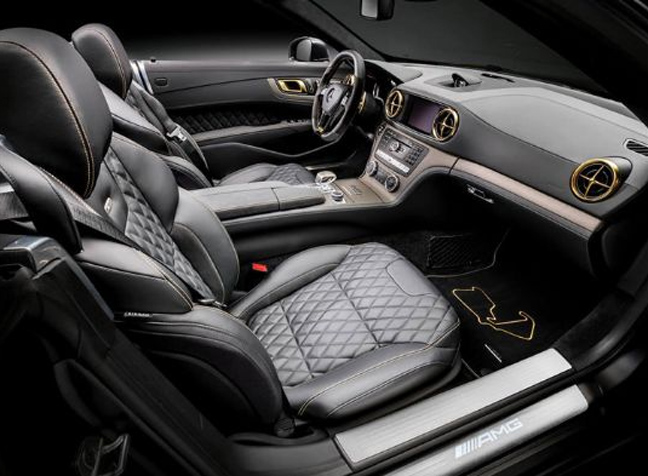 Κρίνοντας από τις χρυσές λεπτομέρειες μέσα-έξω, πιθανολογούμε πως ο πρωταθλητής ασχολήθηκε με την μαύρη SL63, η οποία έχει ως έμβλημα την πίστα του Silverstone.